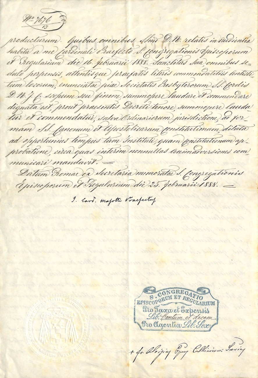 Wszystko to zostało przedstawione Ojcu Świętemu na prywatnej audiencji przez kardynała Prefekta Świętej Kongregacji Biskupów i Zakonników, 16 lutego 1888 roku. Po dogłębnej refleksji i uważnym przeanalizowaniu listów polecających, wydanych przez zainteresowanych Biskupów, Jego Świątobliwość raczył zaaprobować i wysoko ocenić cel, do którego dąży wspomniane Stowarzyszenie Księży Najświętszego Serca, pozostawiając je jednak na razie pod jurysdykcją Ordynariuszy, zgodnie z przepisami Świętych Kanonów i Konstytucji Apostolskich oraz odkładając na później zatwierdzenie samego Instytutu i Konstytucji. Jego Świątobliwość ograniczył się na razie do zalecenia, aby przekazano różne uwagi dotyczące [poprawy] Konstytucji [Instytutu].