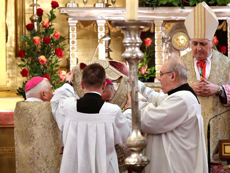 Następnie nowy metropolita otrzymał insygnia jego biskupiej władzy. Na ramiona metropolity - z pomocą ks. Mieszczaka - nałożono haftowany perłami i złotą nicią Racjonał św. Jadwigi, zakładany na wyjątkowe uroczystości religijne przez arcybiskupów krakowskich. Następnie nuncjusz przekazał metropolicie pastorał - symbol władzy pasterskiej - i odprowadził do katedry, która jest symbolem urzędu biskupa diecezjalnego. - Co ważne, to nie jest tron. Bardzo często słyszymy, że metropolita zasiadł na tronie. Nie, to jest katedra, bo głównym zadaniem biskupa jest rządzić przez nauczanie - zaznacza ks. Mieszczak. Siedzącemu na katedrze abp. Jędraszewskiemu przedstawiciele duchowieństwa i wiernych złożyli homagium, czyli akt czci, szacunku i chrześcijańskiego posłuszeństwa.