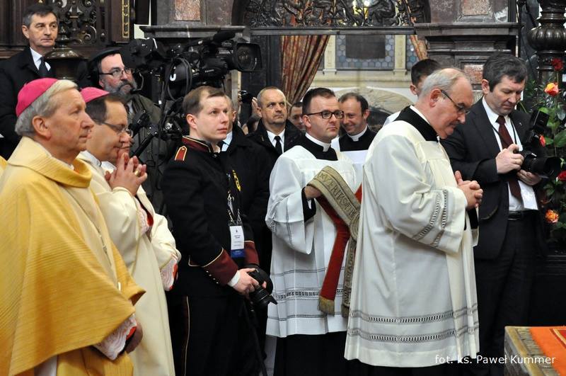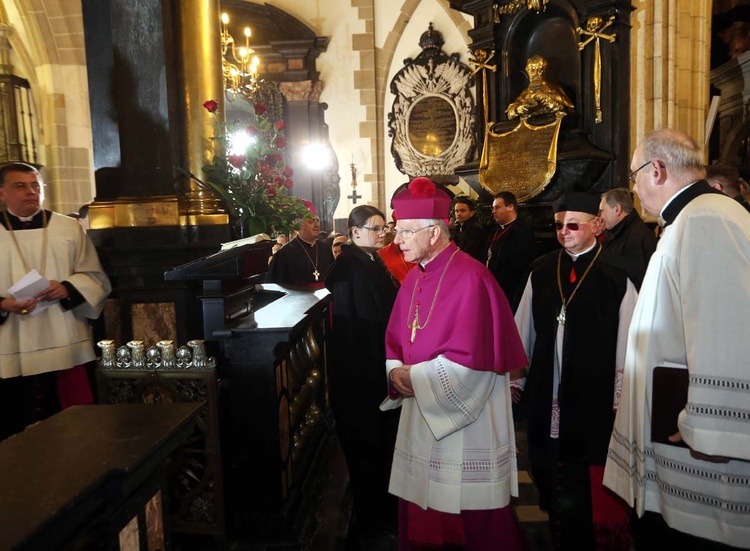 Pierwszym ważnym momentem jest wejście do świątyni, od czego zresztą pochodzi nazwa tej uroczystości – ingres. Przy biciu dzwonu Zygmunta abp Jędraszewski wszedł do katedry znajdującym się po jej prawej stronie tzw. wejściem królewskim. To nie było zwykłe wejście do kościoła, ale spotkanie pasterza diecezji z jej wiernymi, ze wspólnotą – wyjaśnił ks. Mieszczak. U progów świątyni Arcybiskupa powitali kanonicy kapituły katedralnej. Tam też ucałował krzyż i pokropił wiernych wodą święconą. Następnie nowy metropolita krakowski udał się do konfesji św. Stanisława, by ucałować relikwie swojego świętego poprzednika, a następnie do kaplicy Najświętszego Sakramentu (za głównym ołtarzem). To właśnie przy ołtarzu koronacyjnym - po przebraniu się w szaty liturgiczne - odbyła się główna część uroczystości.