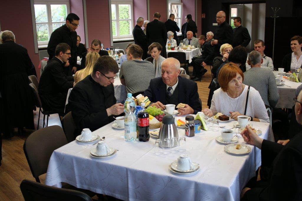 Następnie goście zostali zaproszeni do refektarza na obiad, a po chwili przerwy na spotkanie „przy kawie” do auli seminaryjnej. Ostatni punkt programu okazał się być najdłuższym, bo towarzyszyło mu wiele opowieści. Najpierw księdza Chmieleckiego o tym jak narodził się projekt zbieramto.pl, dzięki któremu można pomagać misjom „bez pieniędzy”. Zostali też przedstawieni obecni na spotkaniu Darczyńcy misji: wolontariusze pracujący przy „Wakacjach z misjami i językami”, „Agentki 925”, które poświęcają wiele uwagi zbieraniu srebrnej i złotej biżuterii oraz rozprowadzaniu krzyżyków sercańskich, pani nauczycielka, która aktywnie wspiera misje dzięki projektowi szkołazmisją.pl oraz osoby, które do tej pory były znane tylko z korespondencji wychodzącej z biura Sekretariatu Misji i ich ofiar na misje przelewanych na konto bankowe, a dzięki temu spotkaniu była okazja do osobistego zapoznania się. Później głos zabrali Natalia i Damian z Krakowa, którzy opowiadali o sercańskim wolontariacie świeckich w Albanii. Na koniec państwo Paruzel z Bierunia podzielili się przeżyciami z wyjazdu do Indonezji do brata pani Renaty ks. Herberta Hensloka SCJ.