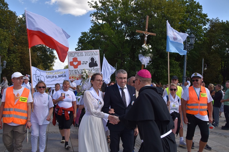 Jasna Góra. Upragnione miejsce każdego pielgrzyma. Na Jasnogórskich Błoniach pielgrzymkę witał kard. Grzegorz Ryś i bp Piotr Kleszcz. 212 pielgrzymów, w tym 14 Honorowych Dawców Krwi przy Elektrowni Bełchatów, aż 52 pielgrzymów, którzy przybyli na Jasną Górę pierwszy raz i 17 duchowych pielgrzymów. Najstarszy pielgrzym to brat Henryk (73lata), najmłodsi to: Jakub (8 miesięcy) i Mikołaj (roczek). Brat Marian na pielgrzymce był 56 razy, a siostra Maria 54.