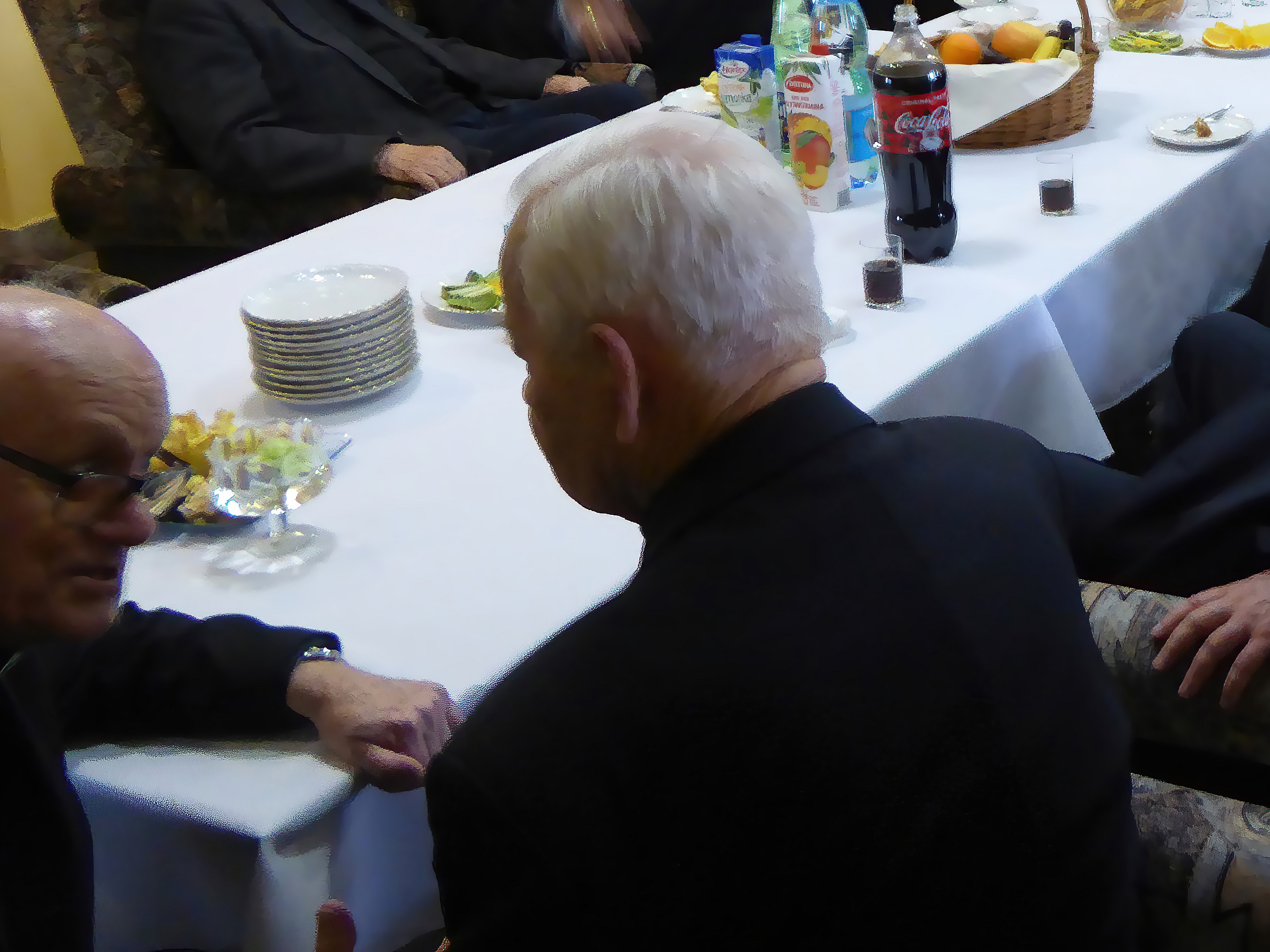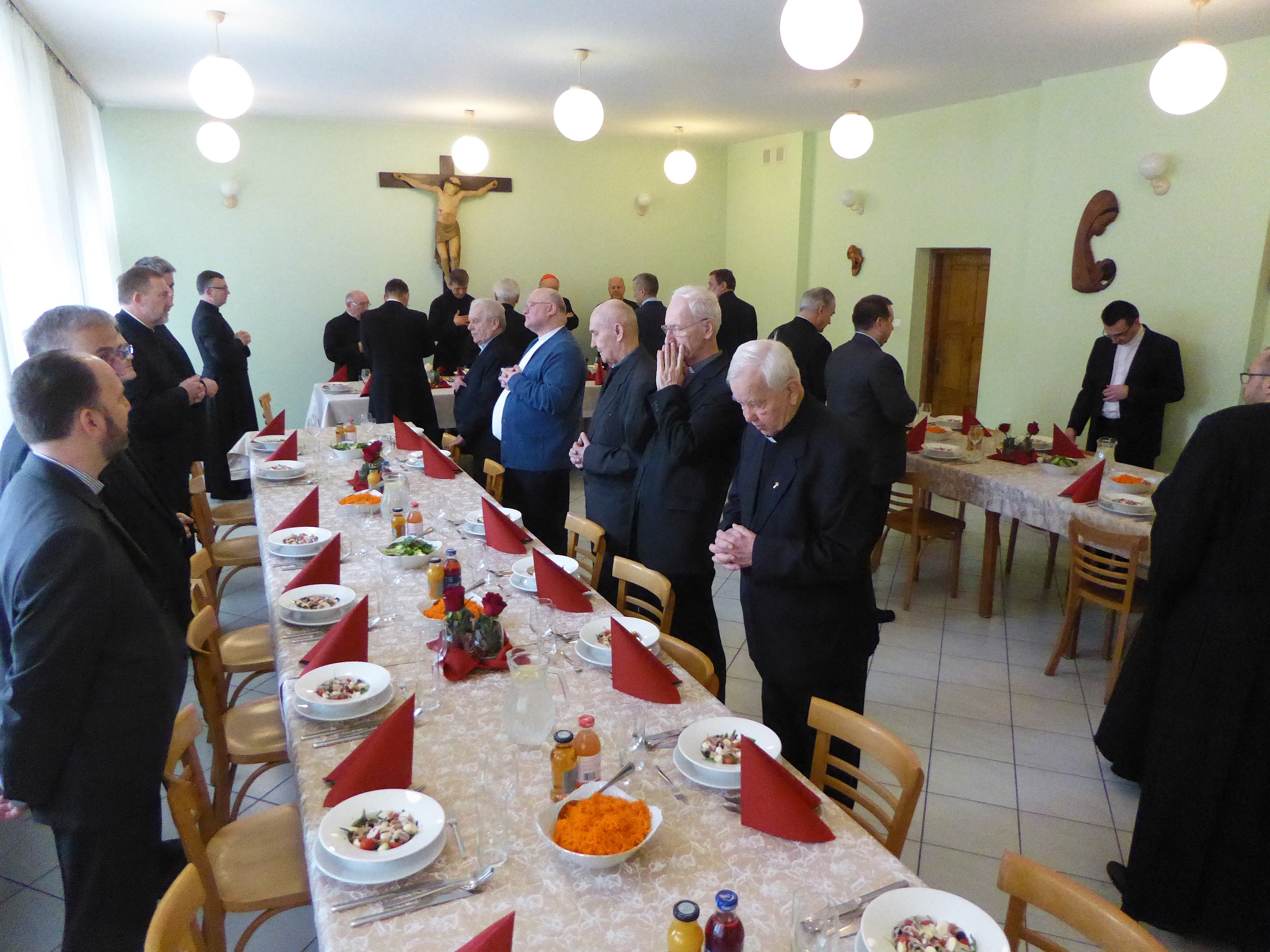 Przenosimy się z kamerą do refektarza domu płaszowskiego. Refektarz odświętnie przystrojony nabrał specyficznego, uroczystego nastroju, wypełniony po brzegi. Ledwie pomieścił zgromadzonych licznie domowników i gości. W czasie obiadu nie brakło tradycyjnych przemówień. Programowe przemówienie wygłosił nowy prowincjał ks. Romuald Skowronek SCJ. Nie brakło w przemówieniu nawiązań do przeszłości, podkreślenia wdzięczności wobec tych, którzy odeszli. I ta część uroczystości w jadalni napawała optymizmem, bo nie tylko obok siebie była twarz koło twarzy, talerz koło talerza, lecz przede wszystkim: serce koło serca.