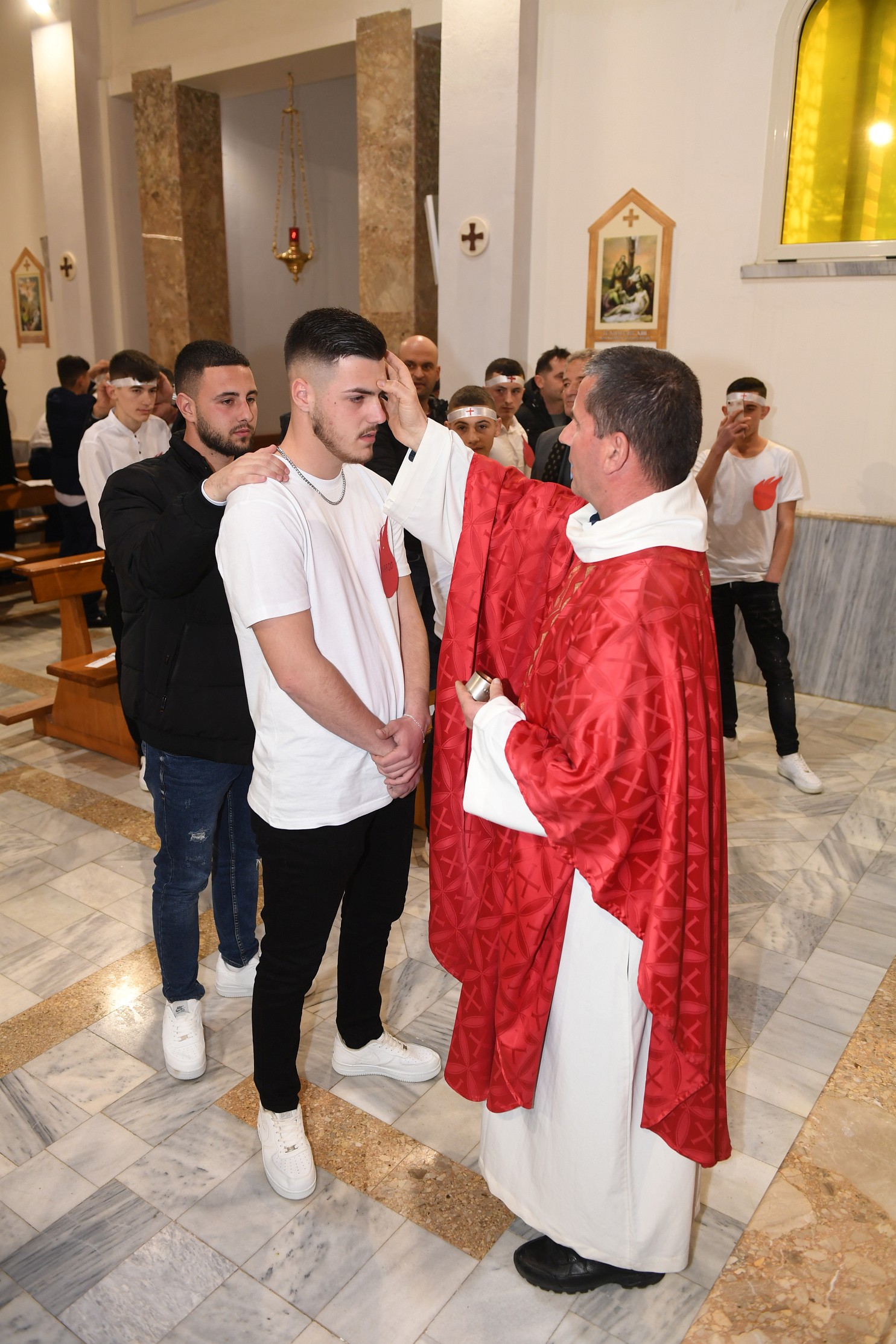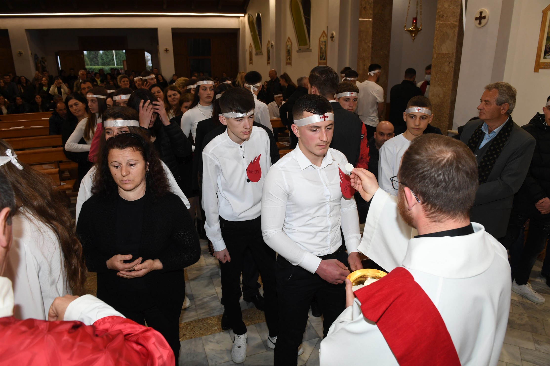 Bierzmowanie tutaj, to oprócz sakramentu także „obowiązkowy” znak Ducha świętego w postaci opaski z krzyżykiem, którą po sakramencie umieszcza się na czole bierzmowanego. Czyni to świadek, którym najczęściej jest ojciec lub matka chrzestna. Uroczystość odbyła się w atmosferze wielkiej familiarności. Czasami dochodzi też do sytuacji bardzo sympatycznych. Jednak ze świadków, gdy musiał wyjść z kościoła na początku kazania odebrać telefon, przeprosił kaznodzieję i zapewnił, że wróci, kaznodzieja oczywiście przyjął to ze zrozumieniem. Ksiądz Nikolin, wikariusz biskupi, zwykle posługuję w kościołach położonych w rejonach górskich – Dukagjin, stąd wielu z naszych parafian, zna go bardzo dobrze, i traktuje jak członka swojej rodziny.