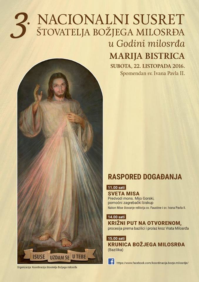 W sobotę 22 października w dzień liturgicznego wspomnienia świętego Jana Pawła II, w największym sanktuarium Maryjnym w Marii Bistrici odbyło się III ogólnochorwackie spotkanie czcicieli Bożego Miłosierdzia. Mszy św. przewodniczył zagrzebski biskup pomocniczy Mijo Gorski i koncelebrowało 40 księży. Przy ołtarzu służyli ministranci z sercańskiej parafii Matki Kościoła i św. Maksymiliana Kolbego z Zagrzebia, a dziewczęta z Ruchu Młodzieży Sercańskiej niosły relikwie świętego Jana Pawła II i świętej Faustyny. Na początku uroczystości bp Gorski przywitał 6000 przybyłych pielgrzymów oraz ks. Andrzeja Wośko SCJ, koordynatora Stowarzyszenia czcicieli Bożego Miłosierdzia w całej Chorwacji. Podczas homilii Biskup podkreślał zasługi wielkiego papieża Jana Pawła II dla narodu chorwackiego: za jego staraniem Chorwacja odzyskała niepodległość, a dzięki Papieżowi kardynała Alojzego Stepinaca możemy nazywać błogosławionym. Św. Jana Paweł II wzywał także do miłości Boga, Ojczyzny i rodziny. Po zakończeniu Eucharystii ks. Andrzej Wośko przywitał pielgrzymów, podziękował Panu Bogu za hojne łaski, złożył wyrazy wdzięczności Księdzu biskupowi i wszystkim księżom oraz zaprosił wszystkich by stawali się "iskierką", która będzie zapalać serca innych ludzi miłością do Jezusa Miłosiernego. Po południu odbyła sie Droga Krzyżowa, procesja i uroczyste przejście przez Bramy Miłosierdzia. Po nabożeństwie ku czci Bożego Miłosierdzia ks. Andrzej Wośko odmówił akt poświecenia Ojczyzny Bożemu Miłosierdziu. W pielgrzymce wzięli również udział sercanie: ks. Marko Šop SCJ, ks. Tomasz Cybula SCJ oraz ks. Artur Makara SCJ.