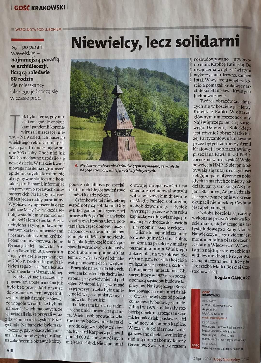 W krakowskim dodatku Gościa niedzielnego (https://krakow.gosc.pl/doc/6397033.Niewielcy-lecz-solidarni) ksiądz Andrzej Sawulski SCJ Rektor kościoła rektorialnego w Glisnem miał okazję pokazania historii tego kościoła. Przy okazji odnowienia dachu kościoła można zobaczyć małą i prężną wspólnotę, której zależy na tym miejscu pośród zielonych wzgórz. W tekście można zobaczyć siłę tej wspólnoty, która nawet po ciężkim okresie próby garnie się do miejsca, które sami wznieśli, by mieć to miejsce kultu i widocznej łączności z Bogiem. "Są – po parafii wawelskiej – najmniejszą parafią w archidiecezji, liczącą zaledwie 80 rodzin. Ale mieszkańcy Glisnego jednoczą się w czasie prób." Zachęcamy do lektury.