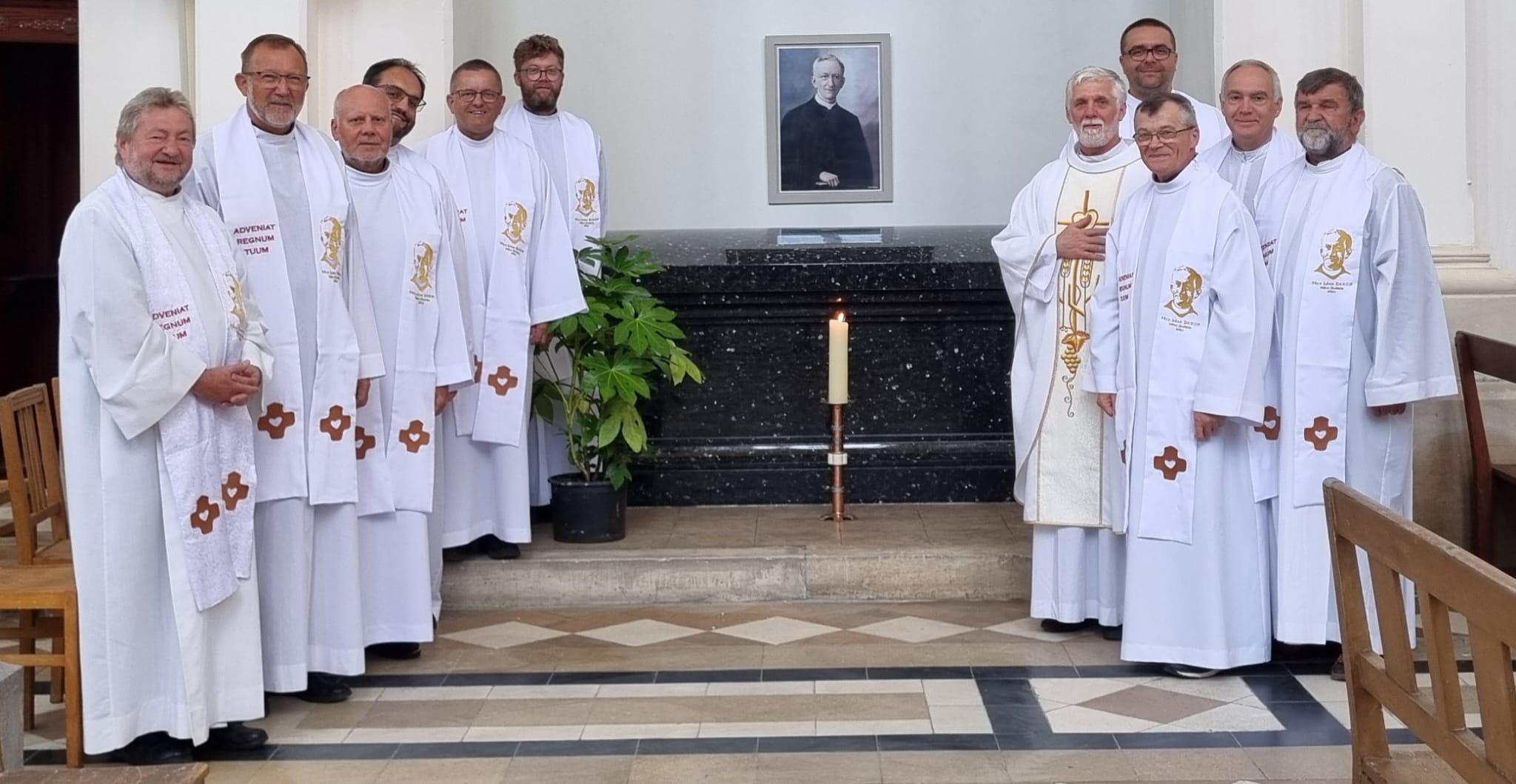 Ósmy dzień rozpoczęła Msza Święta w kaplicy domu brukselskiego, sprawowana przez ks. Jakuba, w 100-lecie śmierci ojca Założyciela. Dzień poświęcony był historii pierwszych ojców, zwłaszcza tych, którzy znali i wiedzieli o. Dehona, a których mieli szansę poznać uczestnicy pielgrzymki, szczególnie ks. Władysława Majkę, świadka śmierci sprzed wieku. Po śniadaniu grupa udała się do najstarszego domu, jaki nieustająco (od 1889) należy do Zgromadzenia, a który znajduje się w Clairefontaine na pograniczu Belgii i Luksemburga. Ks. Nico Turmes, ekonom prowincjalny EUF, oprowadził pielgrzymów po dawnej szkole Zgromadzenia dla Luksemburczyków, w której obecnie znajduje się centrum duchowo-konferencyjne. Po obiedzie konwój udał się do miasta Luksemburg, gdzie w katedrze nawiedził grób pierwszego następcy o. Dehona, bpa Józefa Philippe’a. Z lotniska w Luksemburgu ks. Jakub udał się do Rzymu, zaś dziewiątka pątników udała się do domu prowincji niemieckiej w Maria Martental koło Cochem w diecezji trewirskiej. W miejscowym kościele sanktuaryjnym odprawiona została adoracja.