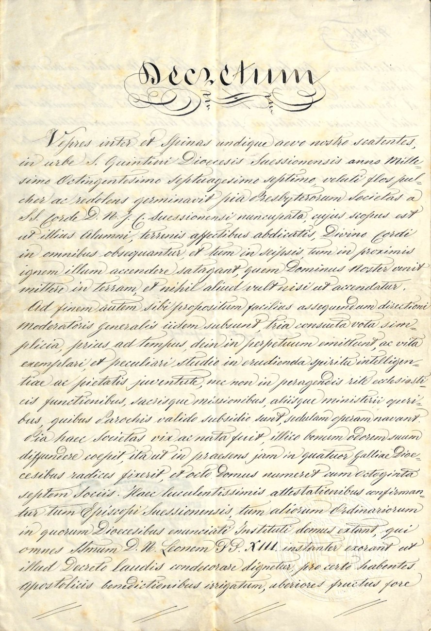 Jak wdzięczny i pachnący kwiat, pobożne Stowarzyszenie Księży Najświętszego Serca Jezusowego zakwitło w Saint-Quentin (diecezja Soissons) w 1877 roku, pośród krzewów i cierni, które w naszych czasach ze wszystkich stron wdzierają się do świata. Uwolniwszy się od trosk ziemskich, członkowie tego Instytutu ośmielają się dostąpić zaszczytu oddania się, bez zastrzeżeń i bez miary, na potrzeby Boskiego Serca Jezusa – stąd ich nieustanna troska o rozpalanie, najpierw we własnych sercach, a potem w sercach otaczających ich ludzi, tego płomienia, który nasz Pan przyszedł przynieść na ziemię i który tak bardzo pragnie, aby z dnia na dzień stawał się coraz bardziej żarliwy.