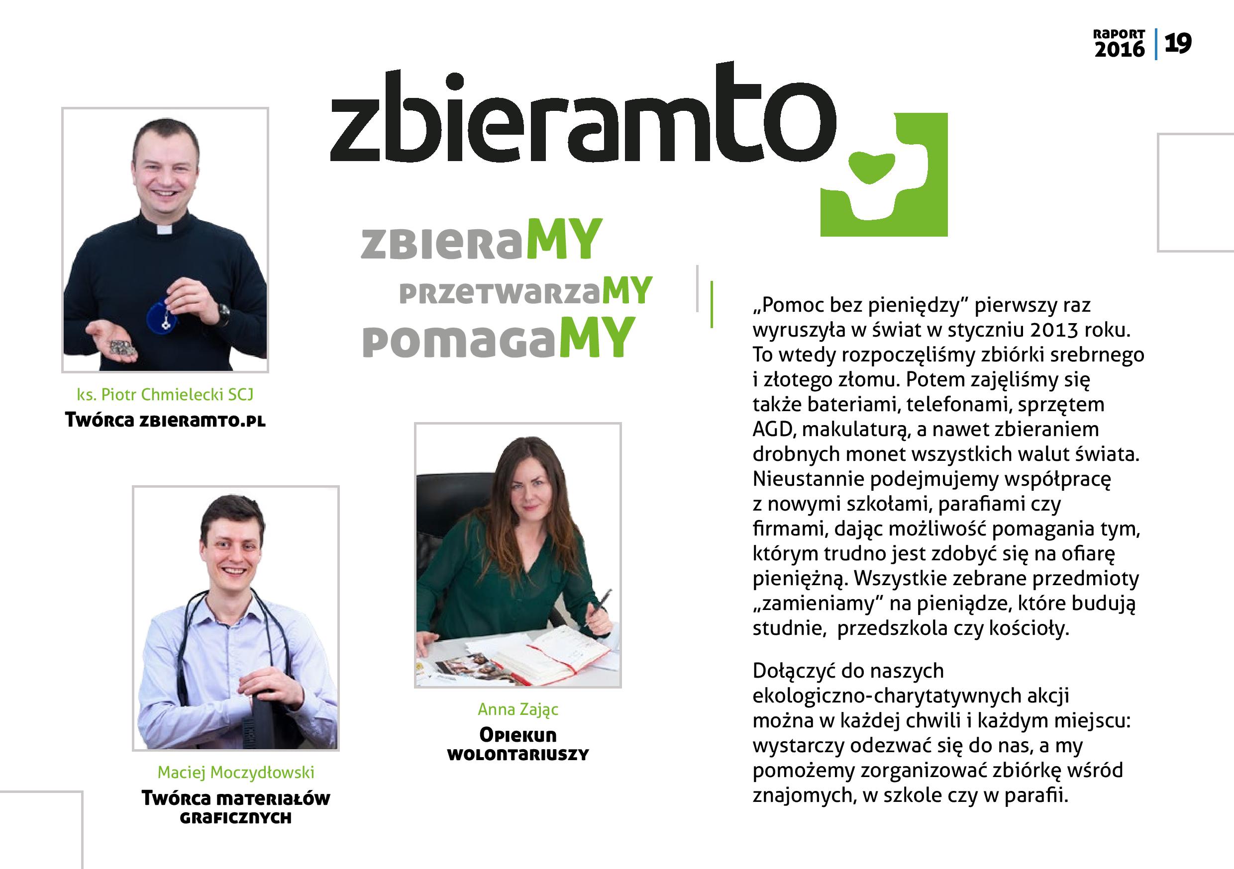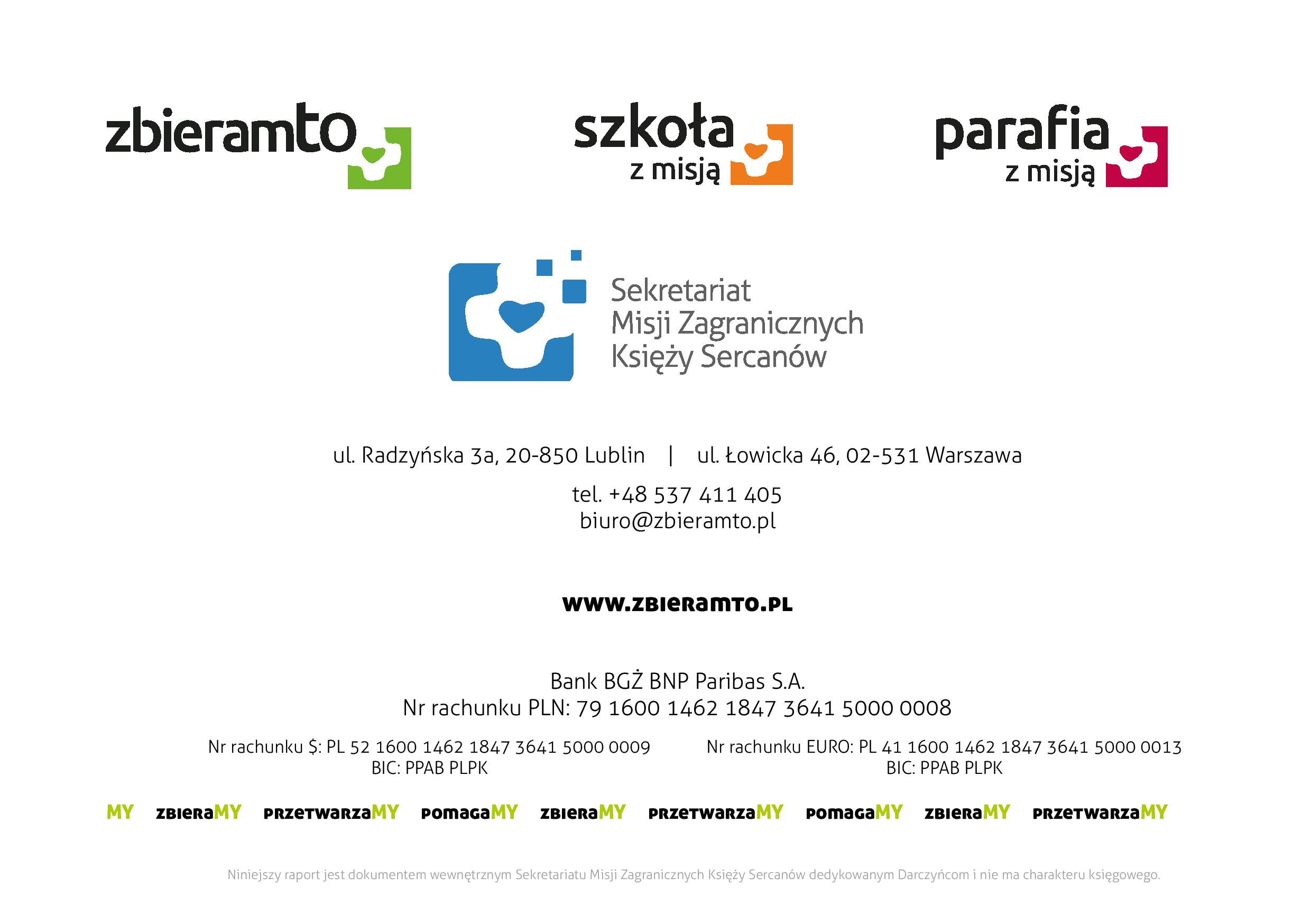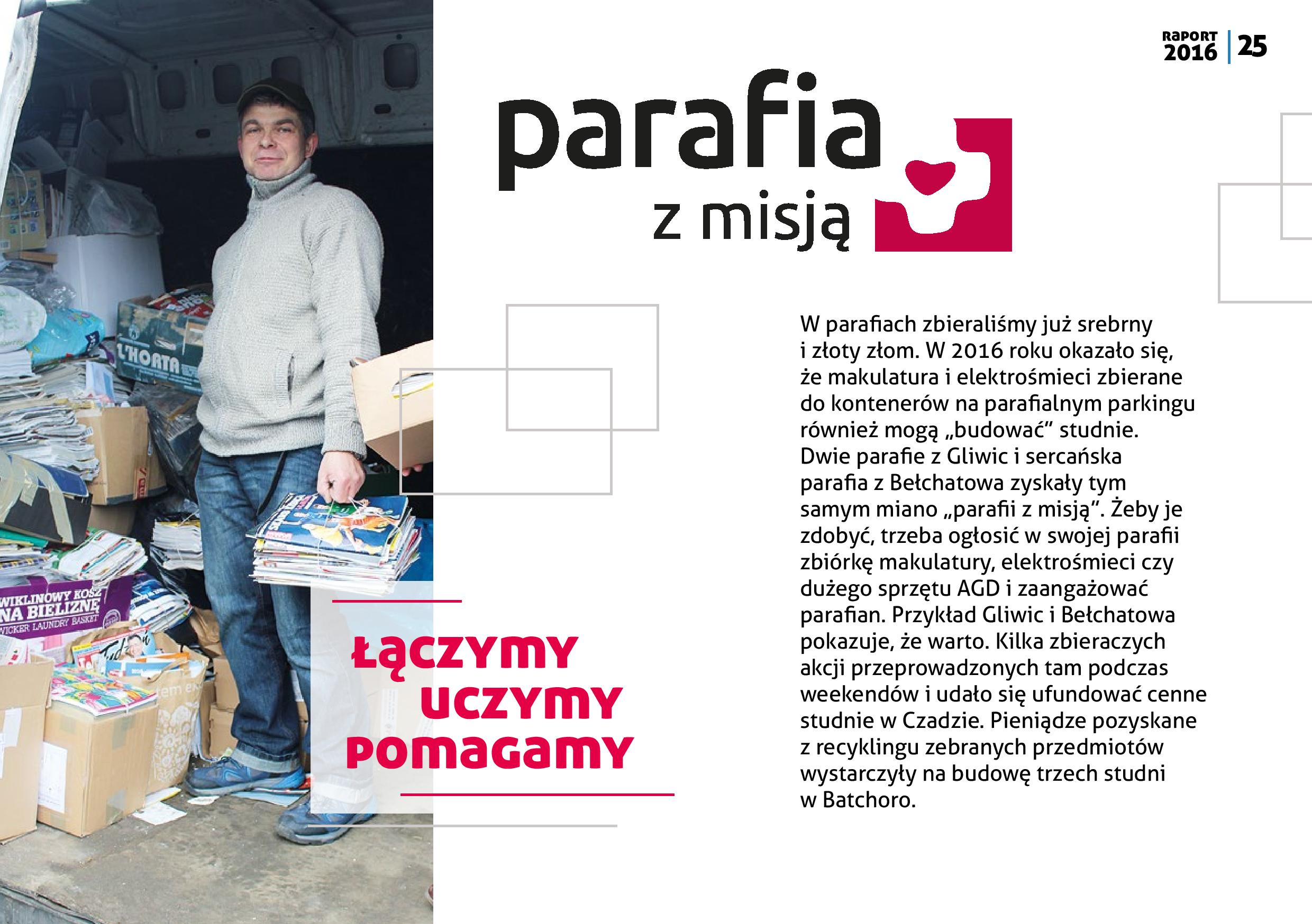 Po drugie, możemy pochwalić się również rozwojem inicjatyw „zbieraczych”. W październiku ruszyła „parafia z misją”, czyli zbiórki makulatury i innych surowców wtórnych przy kościołach. W listopadzie natomiast wystartował portal szkołazmisją. pl dedykowany naszej współpracy ze szkołami i przedszkolami z całej Polski. „Szkoły z misją” prowadzą różnorodne zbiórki przez nas proponowane. Uczymy w ten sposób dzieci i młodzież wrażliwości na środowisko naturalne i potrzeby ubogich. Ponadto szkoła czy przedszkole może odebrać nagrody w programie partnerskim.