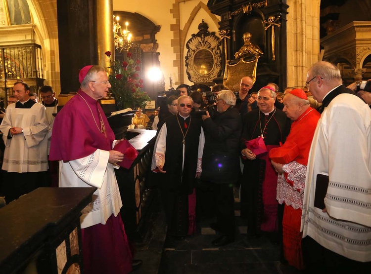 Pierwszym ważnym momentem jest wejście do świątyni, od czego zresztą pochodzi nazwa tej uroczystości – ingres. Przy biciu dzwonu Zygmunta abp Jędraszewski wszedł do katedry znajdującym się po jej prawej stronie tzw. wejściem królewskim. To nie było zwykłe wejście do kościoła, ale spotkanie pasterza diecezji z jej wiernymi, ze wspólnotą – wyjaśnił ks. Mieszczak. U progów świątyni Arcybiskupa powitali kanonicy kapituły katedralnej. Tam też ucałował krzyż i pokropił wiernych wodą święconą. Następnie nowy metropolita krakowski udał się do konfesji św. Stanisława, by ucałować relikwie swojego świętego poprzednika, a następnie do kaplicy Najświętszego Sakramentu (za głównym ołtarzem). To właśnie przy ołtarzu koronacyjnym - po przebraniu się w szaty liturgiczne - odbyła się główna część uroczystości.