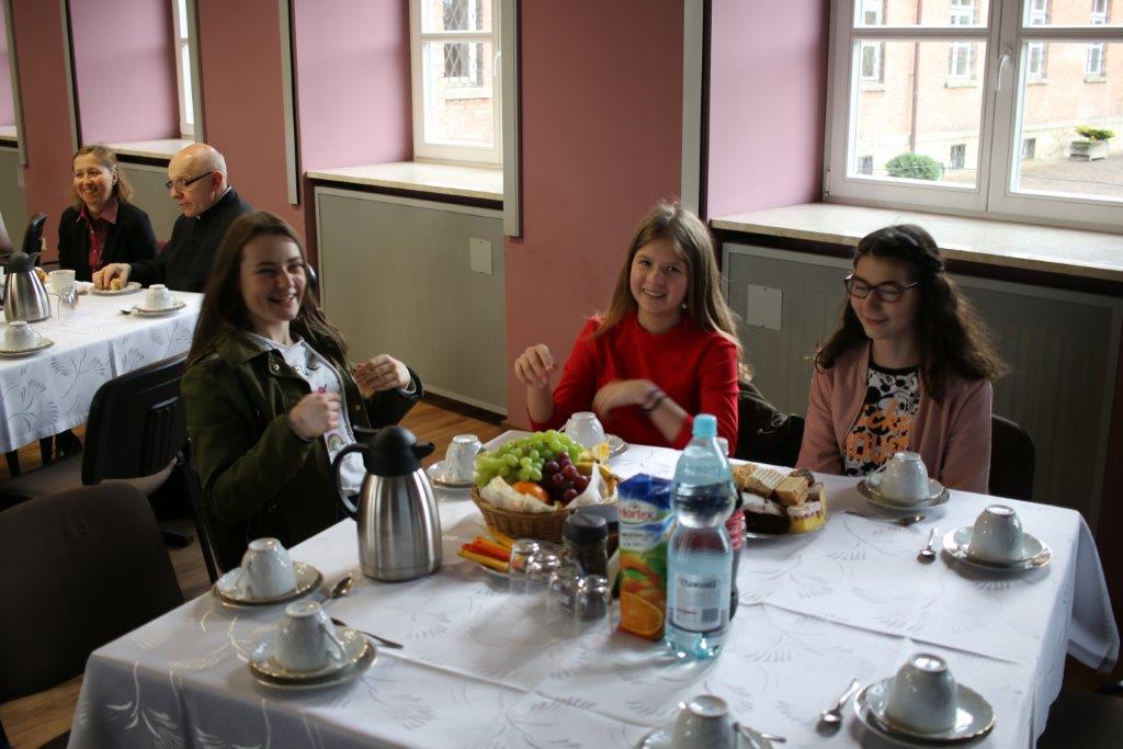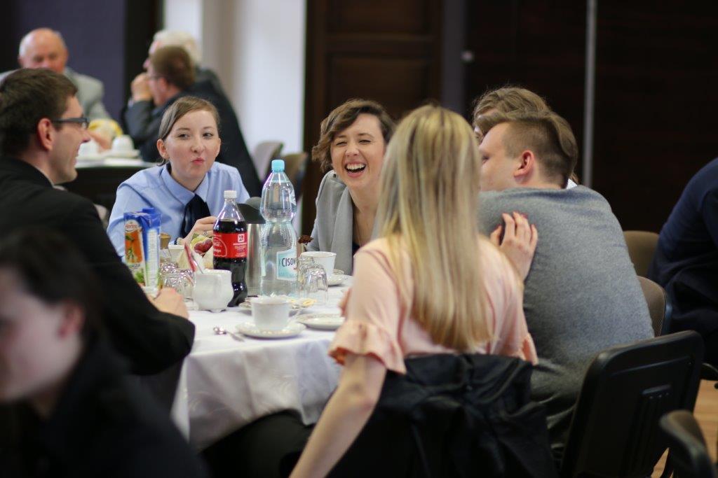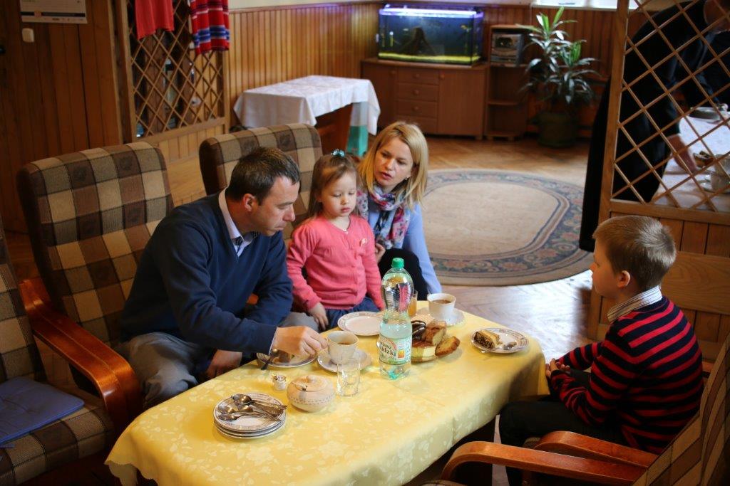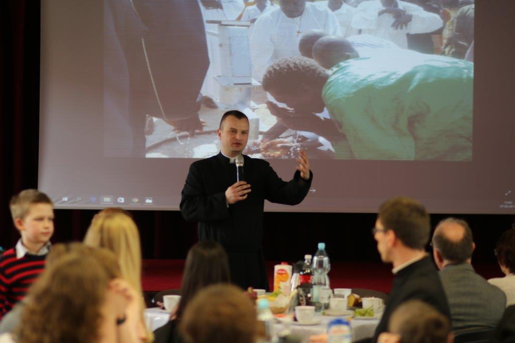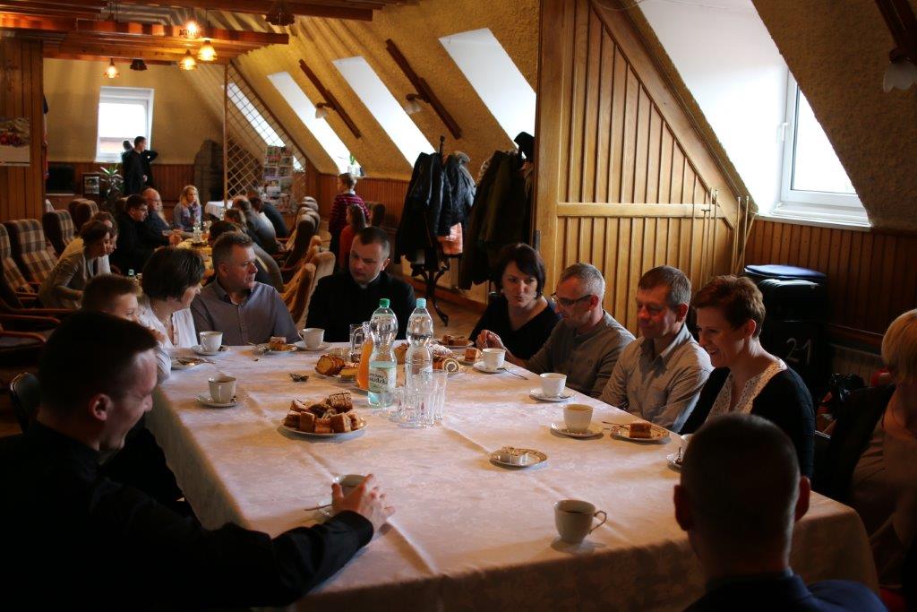 Następnie goście zostali zaproszeni do refektarza na obiad, a po chwili przerwy na spotkanie „przy kawie” do auli seminaryjnej. Ostatni punkt programu okazał się być najdłuższym, bo towarzyszyło mu wiele opowieści. Najpierw księdza Chmieleckiego o tym jak narodził się projekt zbieramto.pl, dzięki któremu można pomagać misjom „bez pieniędzy”. Zostali też przedstawieni obecni na spotkaniu Darczyńcy misji: wolontariusze pracujący przy „Wakacjach z misjami i językami”, „Agentki 925”, które poświęcają wiele uwagi zbieraniu srebrnej i złotej biżuterii oraz rozprowadzaniu krzyżyków sercańskich, pani nauczycielka, która aktywnie wspiera misje dzięki projektowi szkołazmisją.pl oraz osoby, które do tej pory były znane tylko z korespondencji wychodzącej z biura Sekretariatu Misji i ich ofiar na misje przelewanych na konto bankowe, a dzięki temu spotkaniu była okazja do osobistego zapoznania się. Później głos zabrali Natalia i Damian z Krakowa, którzy opowiadali o sercańskim wolontariacie świeckich w Albanii. Na koniec państwo Paruzel z Bierunia podzielili się przeżyciami z wyjazdu do Indonezji do brata pani Renaty ks. Herberta Hensloka SCJ.