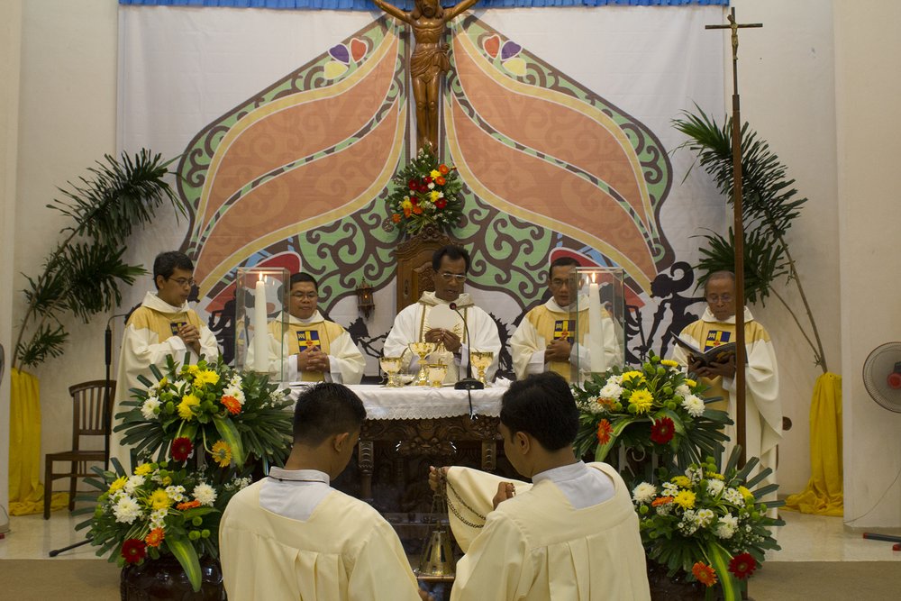 We Mszy świętej, któej przewodniczył przełożony prowincji indonezyjskiej (INA), ks. Alexander Sapta SCJ, udział wzięli nie tylko uczestnicy Międzynarodowego Seminarium Teologicznego, ale także 34 kleryków i jeden brat zakonny, którzy podczas Mszy odnowili swoje zakonne śluby. Wśród koncelebransów znalazł się także ks. Florentinus Heru Ismadi SCJ, wieloletni sekretarz generalny, który świętował 25 lat życia zakonnego oraz ks. Vincent Sri Herimanto SCJ, który rozpoczął posługę przełożonego Scholastykatu, zastępując na tym stanowisku ks. FX Tri Priyo Widarto SCJ. Uruczysta celebracja Mszy świętej została ubogacona śpiewem chóru, któremu towarzyszyła tradycyjna orkiestra "gamelan".